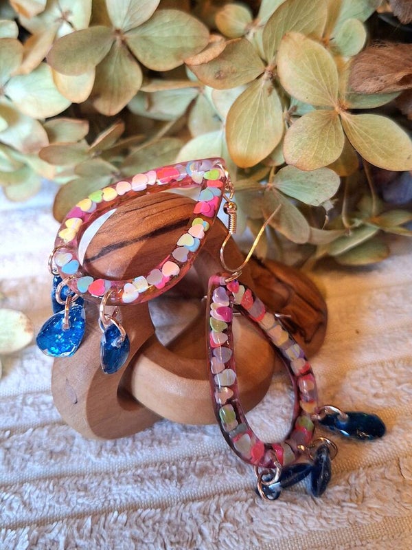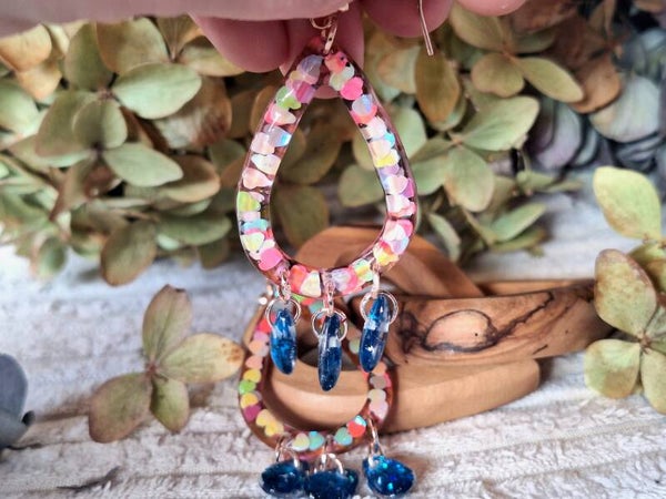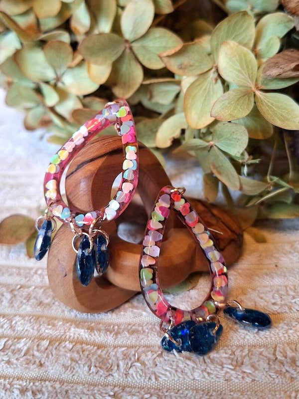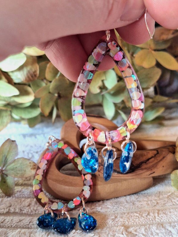 Wer es etwas größer mag, wird diese Hängeohrringe lieben. Der größerer, tropfenförmige Anhänger ist mit bunten Herzen versehen. An diesem befinden sich jeweils 3 weitere kleine Tropfen, die mit blauem Glitzer versehen sind. Besonders edel lässt der rosegoldene Metallanhänger diese Ohrringe erscheinen