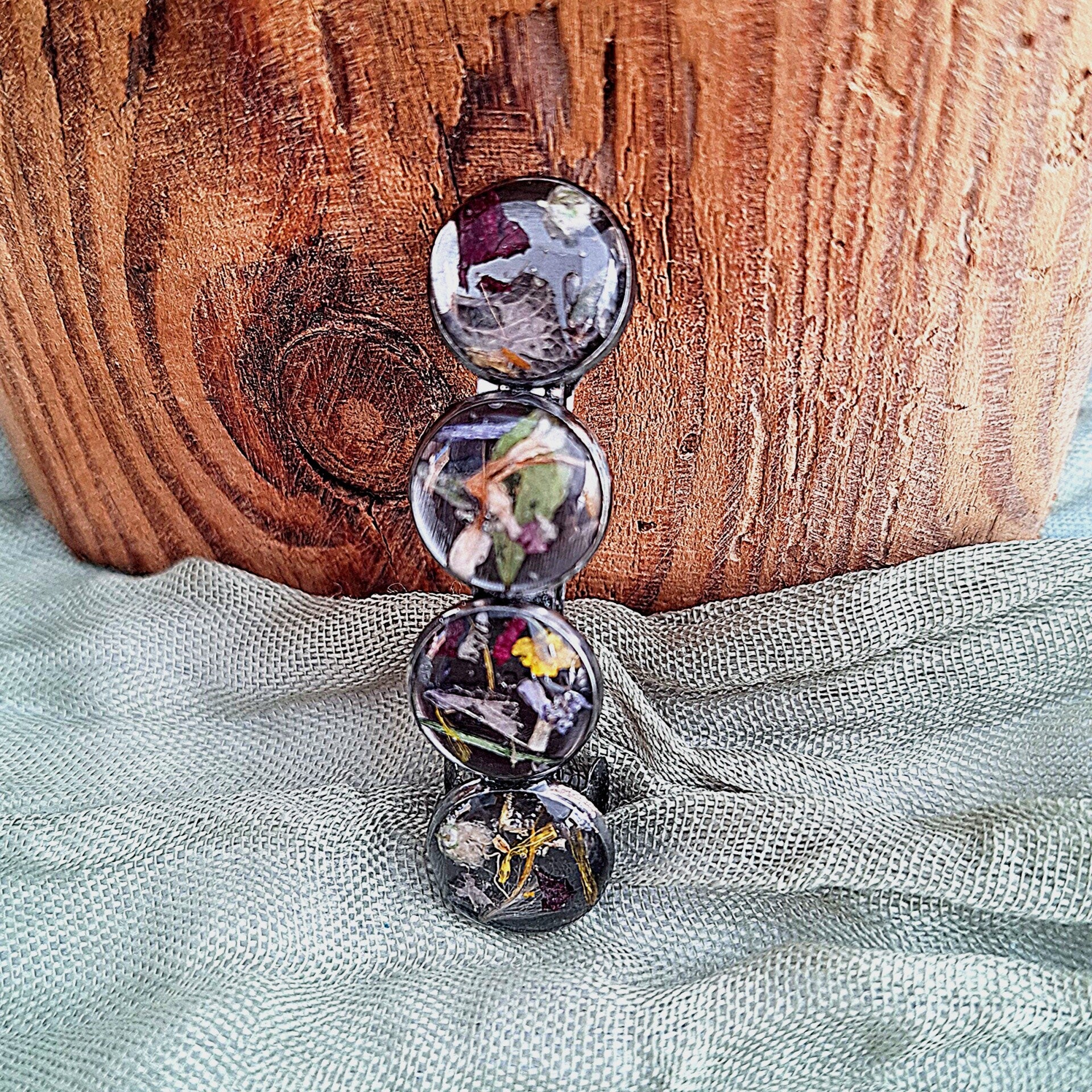 Jedes der vier runden Elemente enthält echte, sorgfältig ausgewählte und getrocknete Blütenblätter, eingebettet in glasklares UV-Resin. Die natürliche Struktur und Farbvielfalt machen jedes Stück zu einem Unikat.